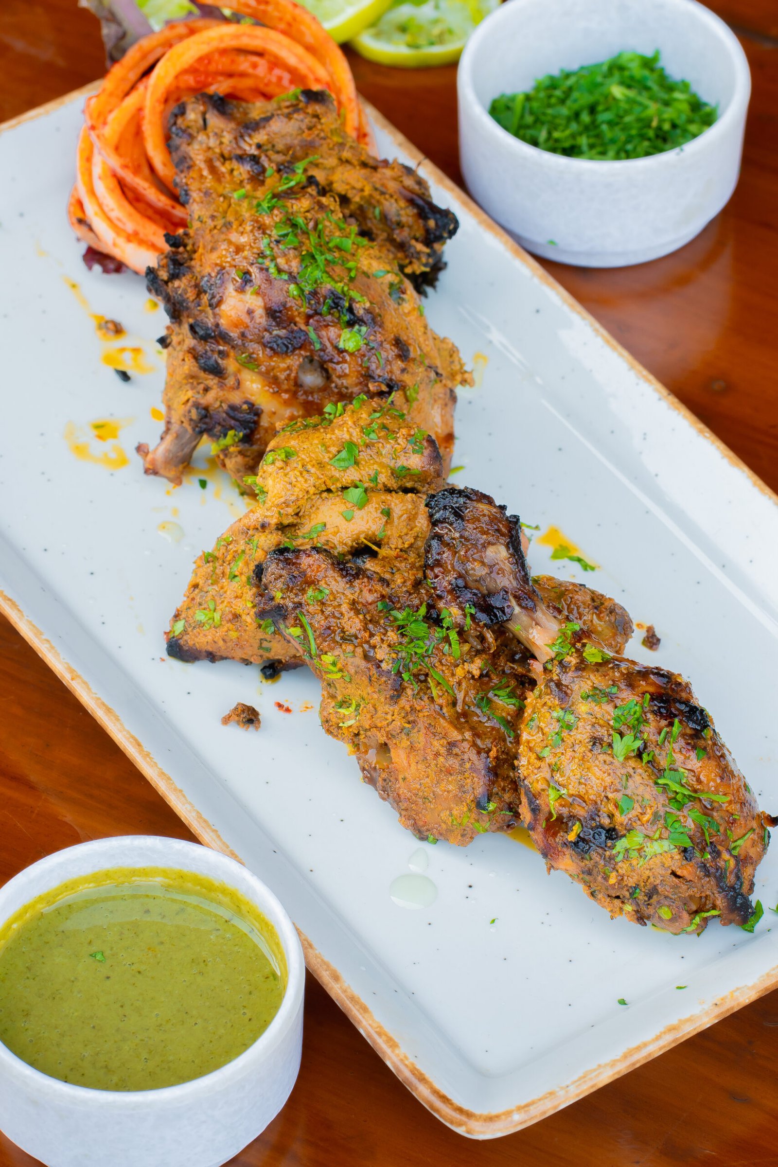 CHICKEN IS MARINATED WITH TRADITIONAL BHATTI SPICES AND HUNG CURD COOKED IN TANDOOR
