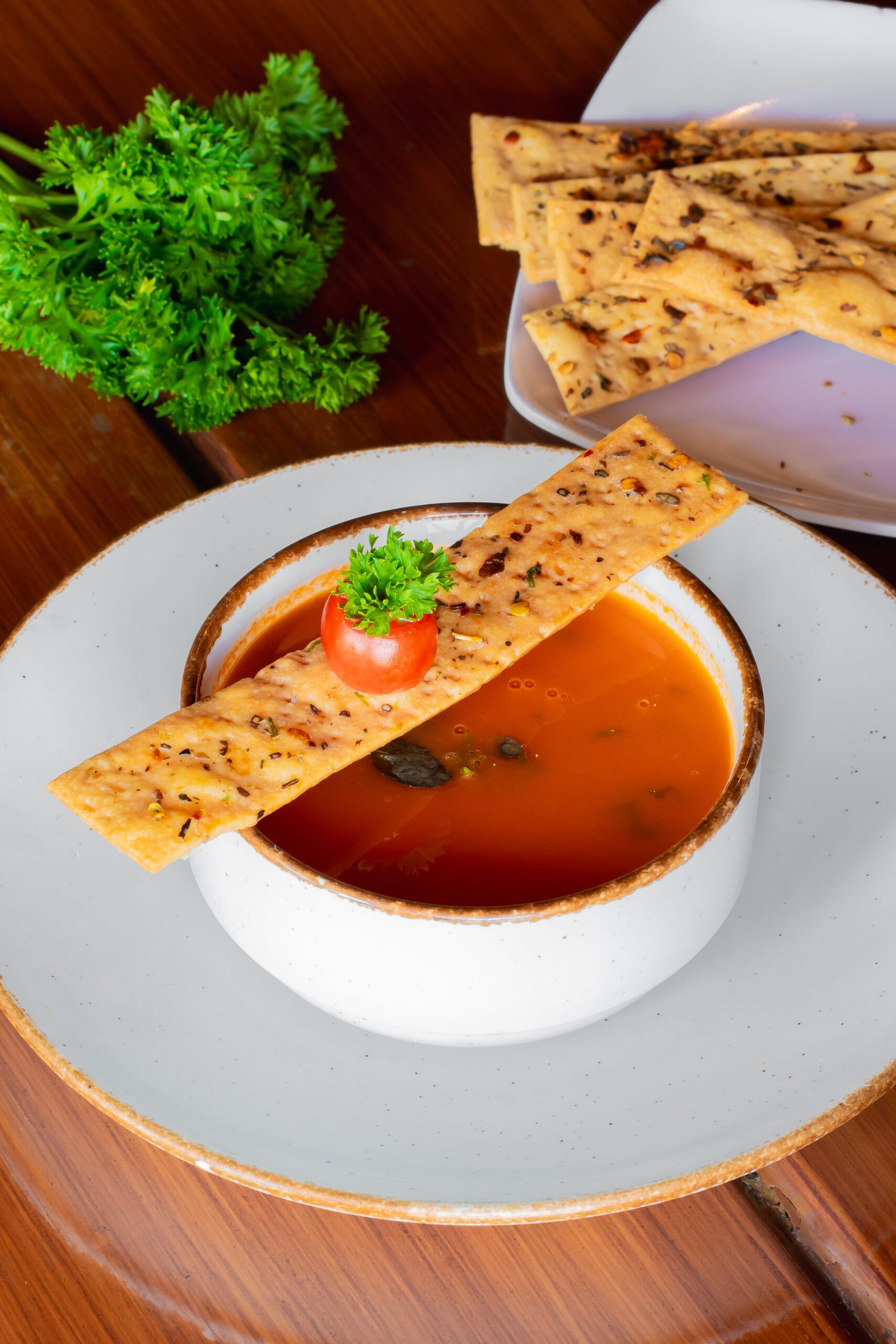 THICK SMOOTH AND TANGY TOMATO SOUP WITH SPRIG OF FRESH BASIL