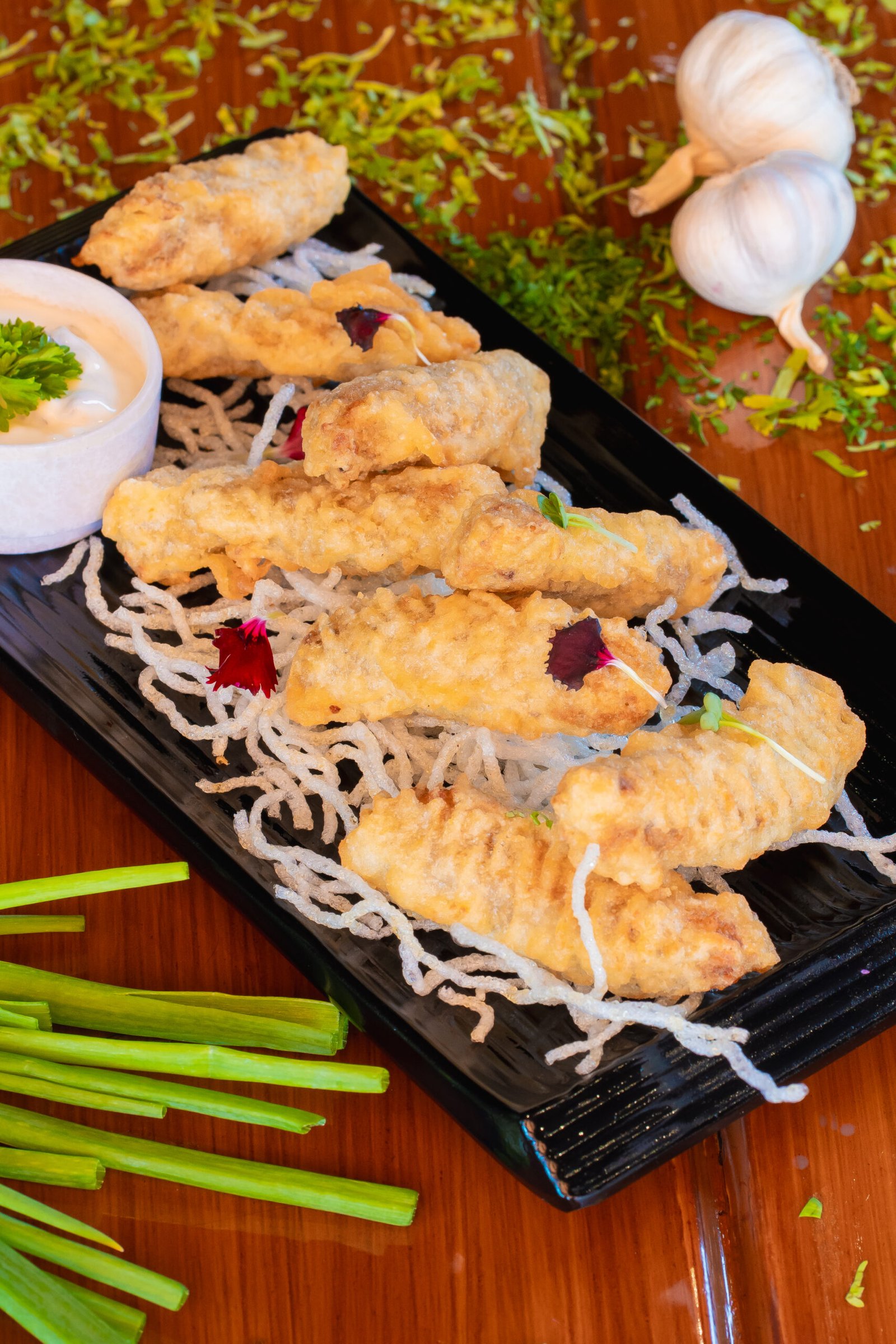 CHICKEN TENDERS IN SPICY BATTER AND CRUMB FRIED SERVED WITH FRENCH FRIES AND MUSTARD MAYO