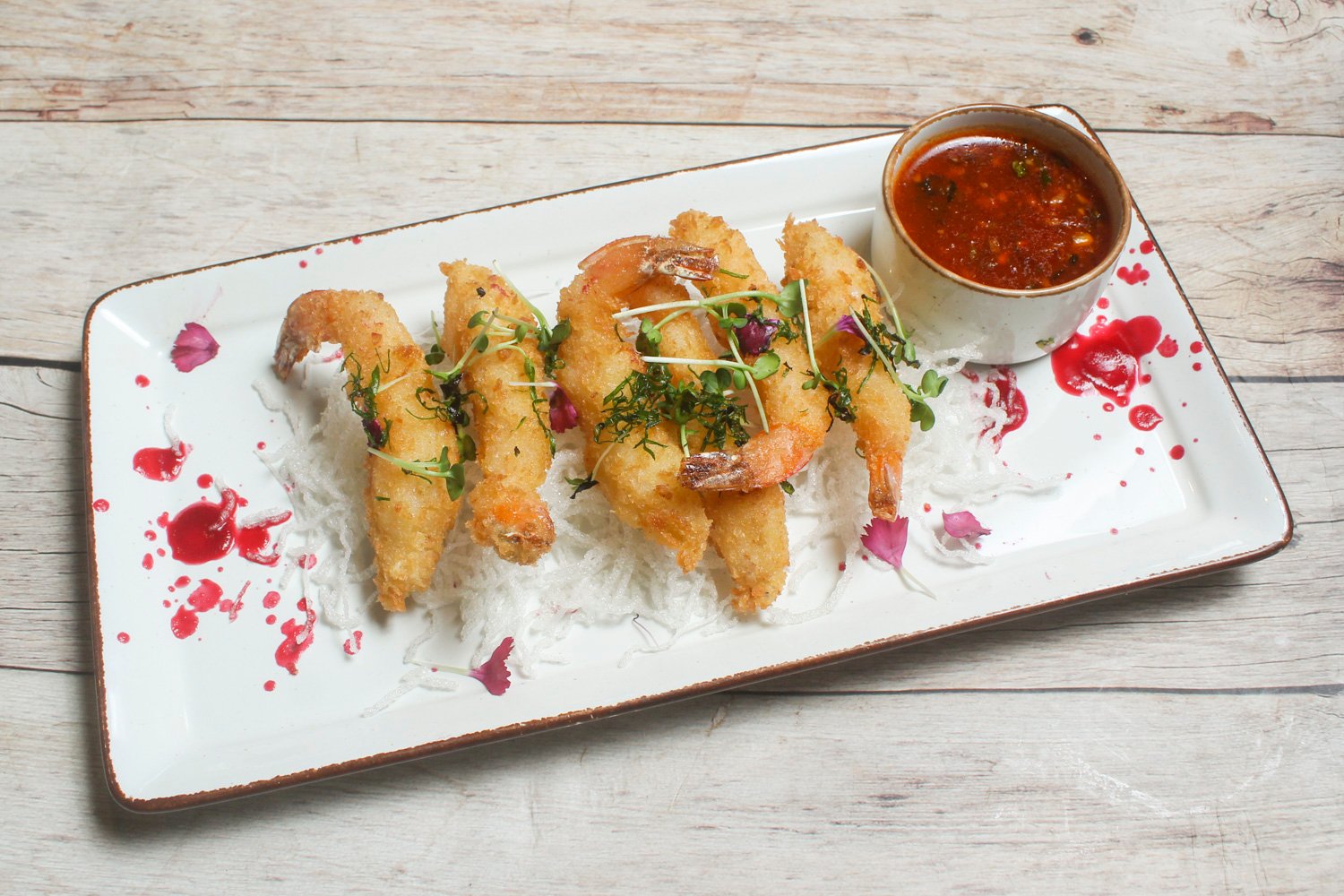 BUTTERFLY PRAWNS DIPPED IN A SPICY BATTER CRUMBED AND DEEP-FRIED TO GOLDEN WITH HOT GARLIC SAUCE