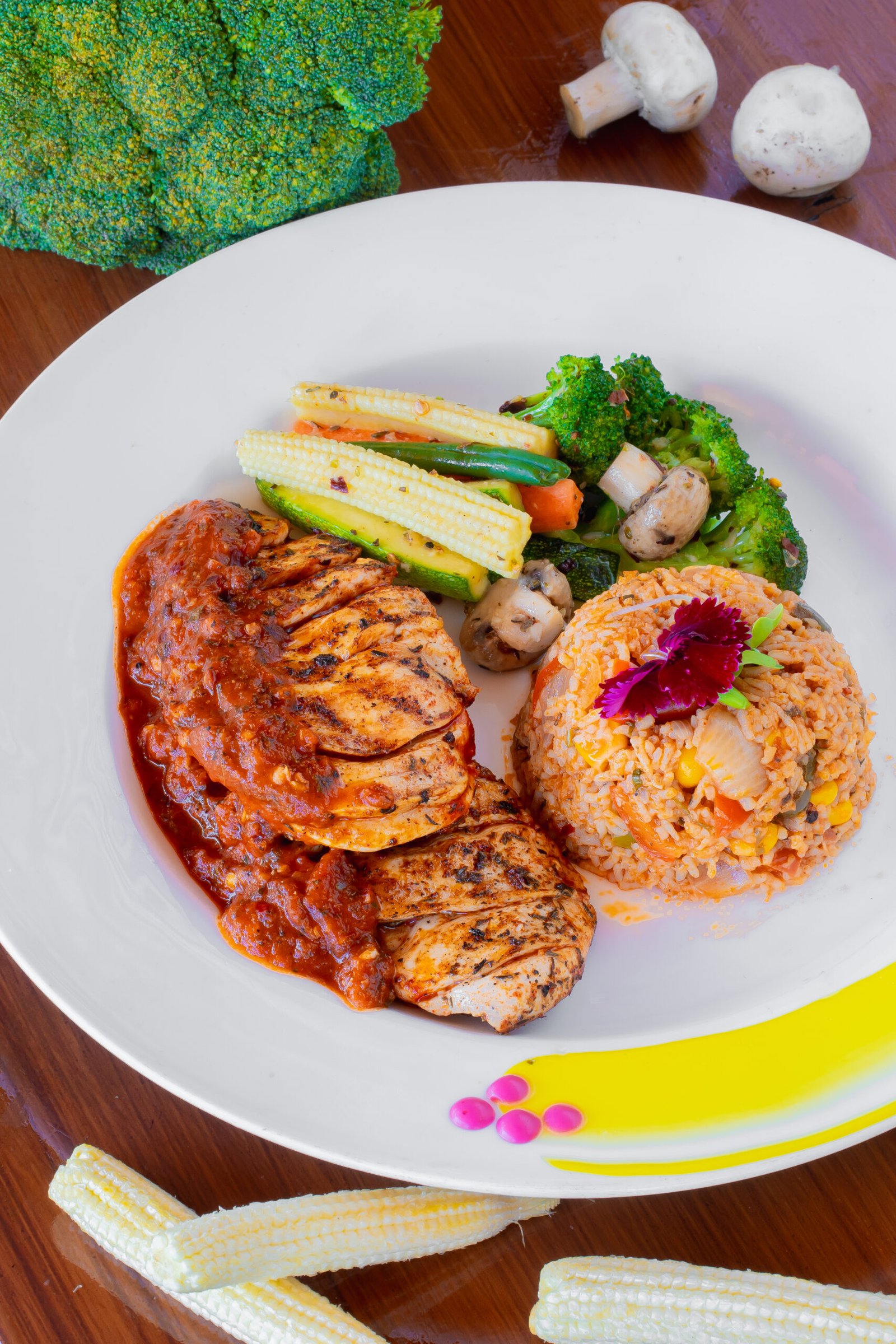 GRILLED CHICKEN BREAST SERVED WITH MUSHROOM SAUCE, MASH POTATO AND SAUTÉED VEGGIES