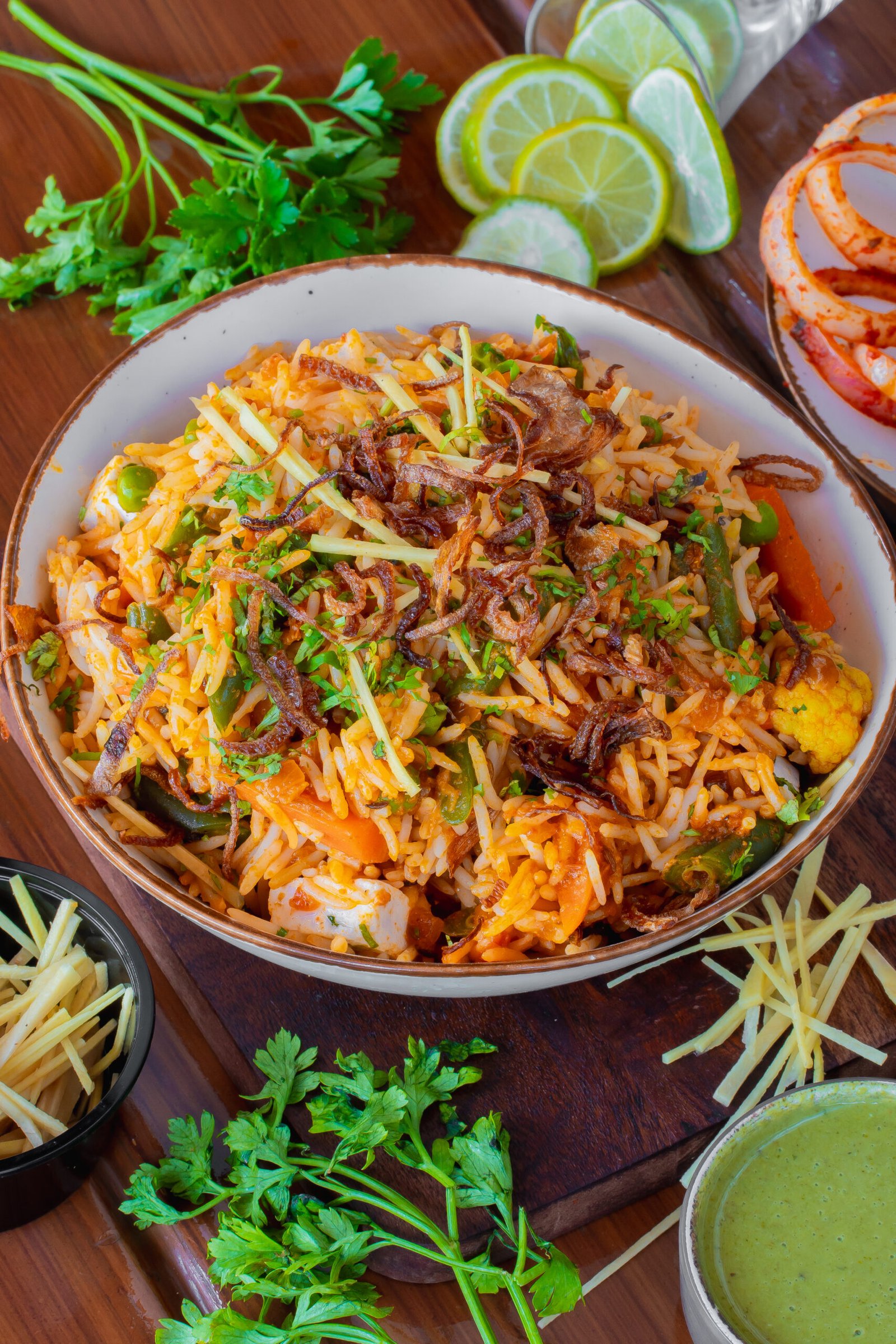 DUM VEG BIRYANI WITH A FLAVOR OF WHOLE SPICES, SAFFRON & KEWRA WITH RAITA