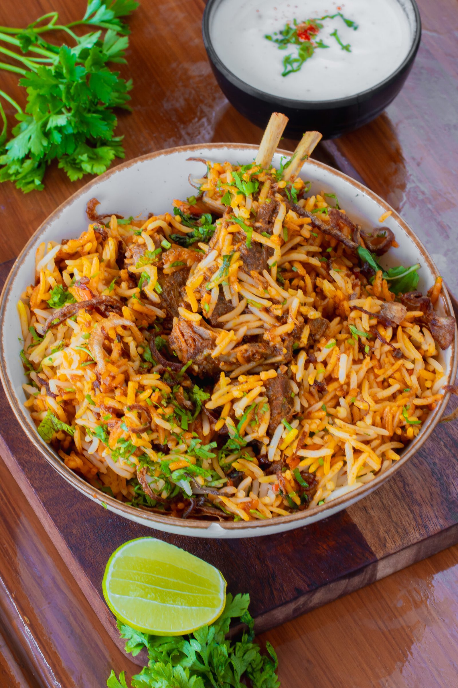 DUM GOSHT BIRYANI WITH A FLAVOR OF WHOLE SPICES, SAFFRON & KEWRA WITH RAITA
