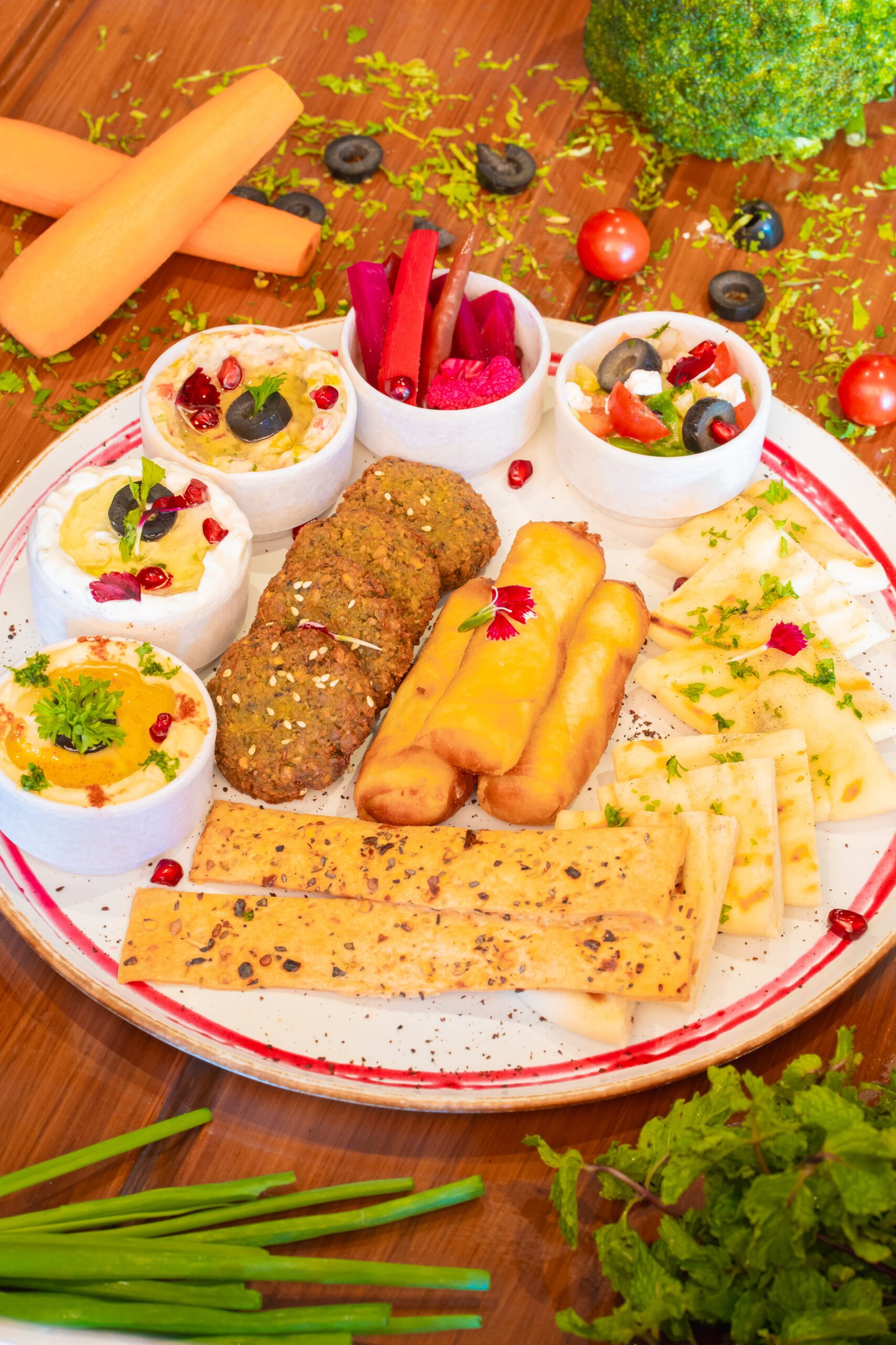 SERVED WITH HUMMUS, BABA GANOUSH, FALAFEL, CHEESE SAMBOUSEK,