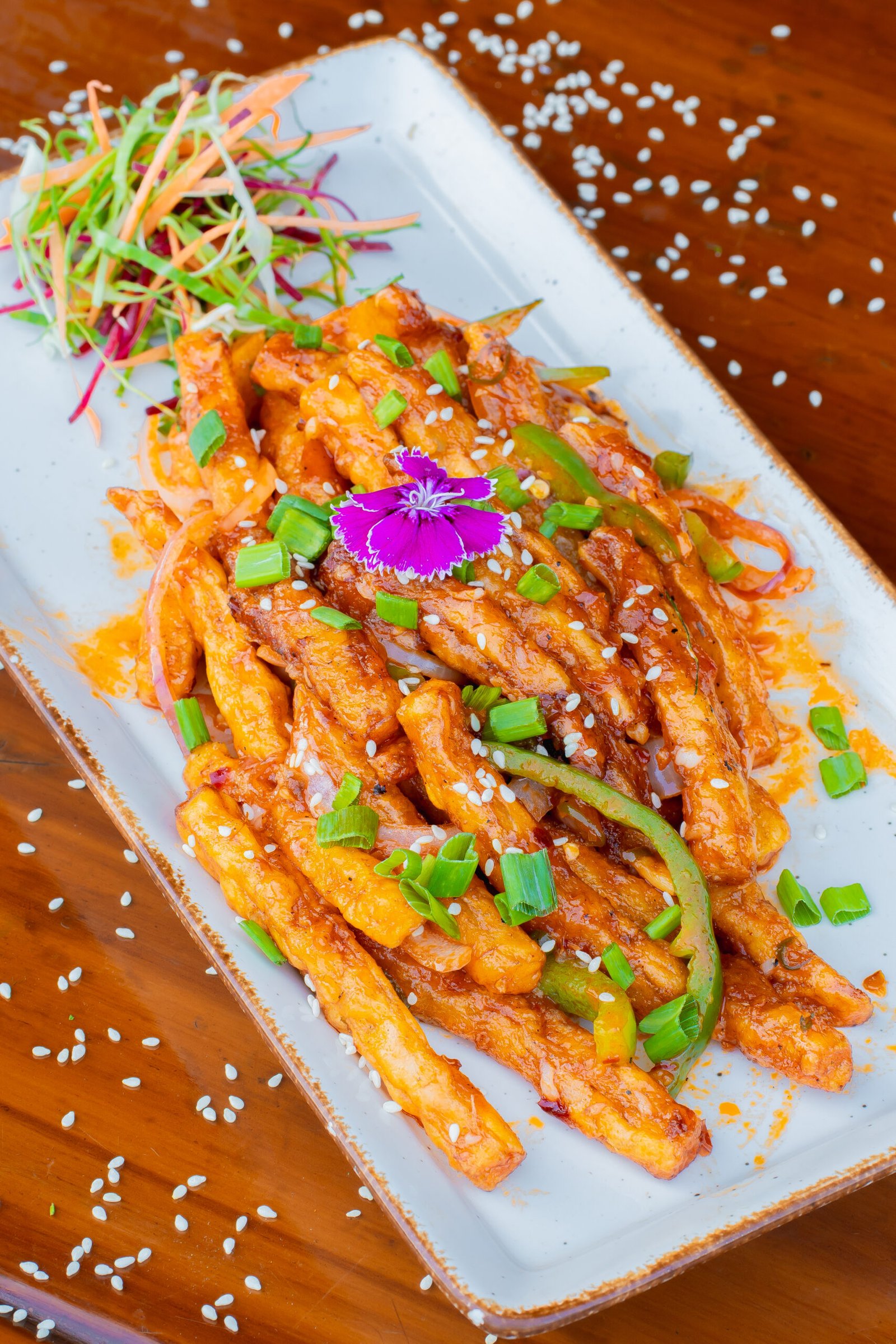 CRISPY FRIED POTATO FINGERS TOSSED IN HONEY CHILLY SAUCE WITH ROASTED SESAME SEEDS