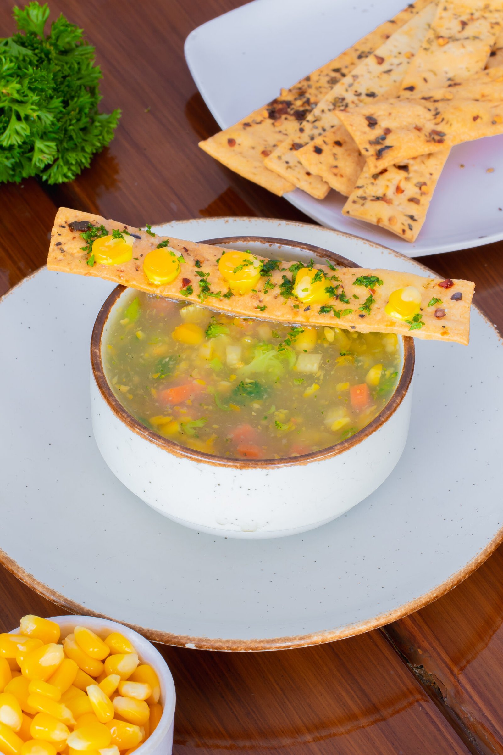 THICK BROTH WITH A BUNCH OF STIR FRIED VEGGIES AND FRIED NOODLES